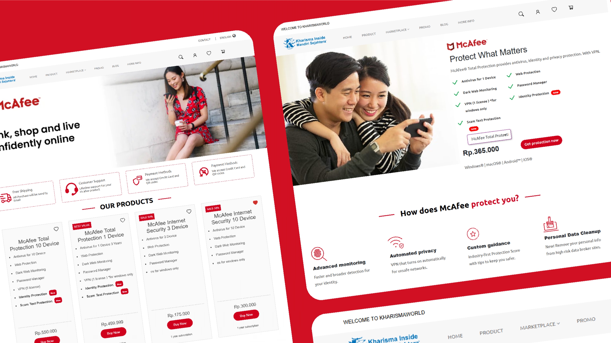 KharismaWorld adalah platform e-commerce yang berfokus pada distribusi resmi produk McAfee di Indonesia dan Asia Pasifik. Aplikasi ini memungkinkan pengguna untuk membeli berbagai produk keamanan digital seperti McAfee Total Protection dan McAfee Internet Security, serta menyediakan informasi terkait ancaman keamanan siber.